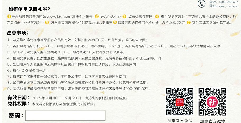 - 2015加意新品礼券,50元无限制加意新品礼品券: