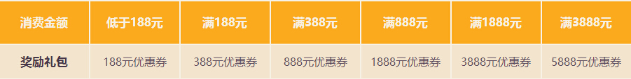 注:每笔消费,仅可获得1个档次的优惠券礼包。每天每位用户最多可获得2个礼包。