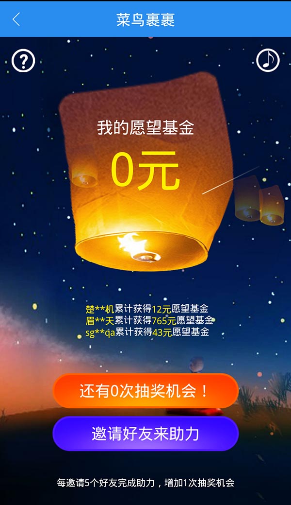 1、 活动期间,用户登录菜鸟裹裹放飞心愿即可获得抽取许愿基金机会;
