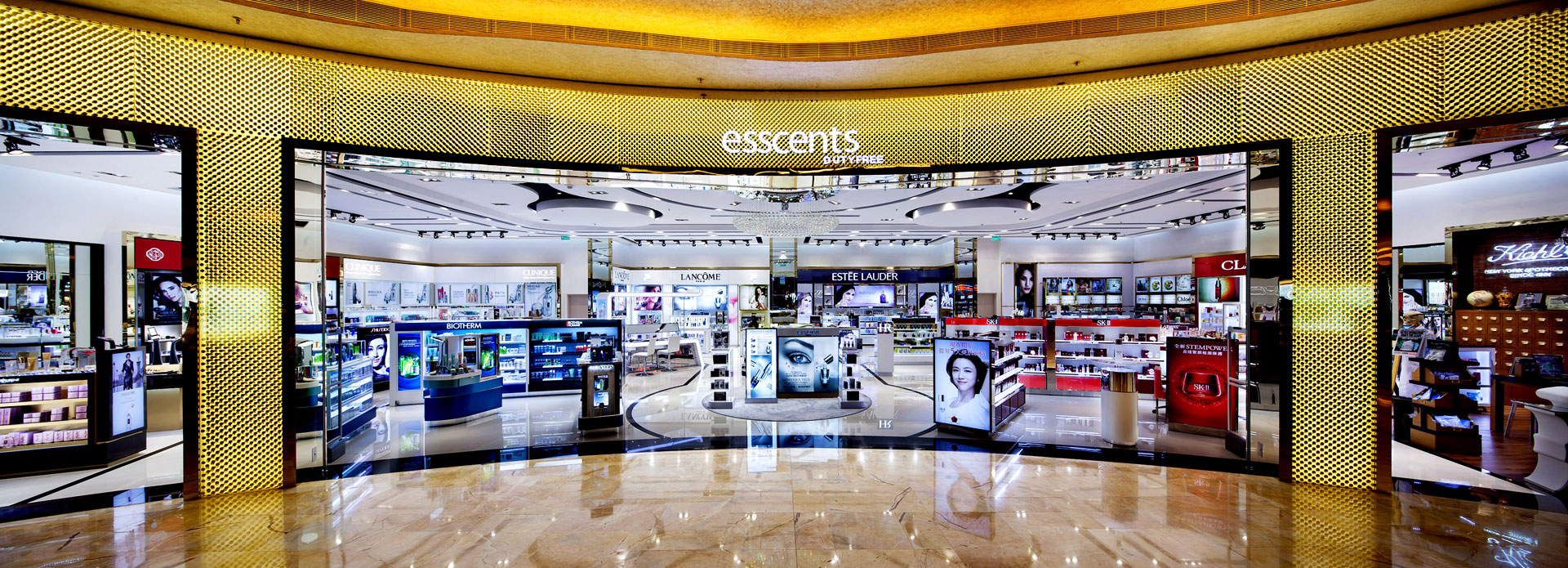 Esscents(duty free)位于澳门金沙城中心,店内集合了:ESTEE LAUDER, LANCOME, SKII, SHISEIDO, YSL, CLARINS, HELENA RUBINSTEIN, BVLGARI, BURBERRY, HUGO BOSS, GUCCI, D&G, MARC JACOBS, BOTTEGAVENETA , CHLOE, GIORGIO ARMARI, RALPH LAUREN, VERSACE, LANVIN, KENZO 等世界顶级化妆品、香水品牌。