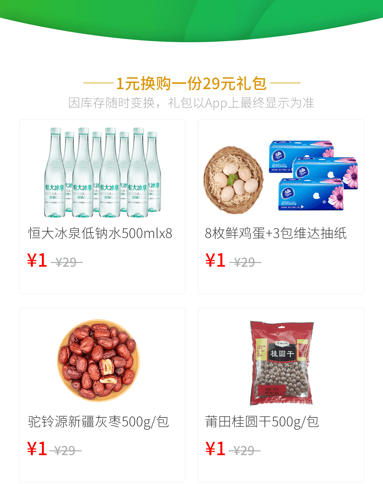 4、1元换购的新手礼包,仅限首单满10元购买;新手礼包的商品组合有多种,由于商品库存随时变化,礼包的商品组合类型,以最终APP中显示为准;也有可能因临时性缺货,暂时无法购买,请耐心等待朴朴补货