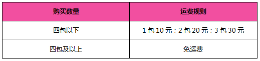如:您购买3包纸尿裤或拉拉裤时,将会收取30元快递配送费用;在您购买4包纸尿裤或拉拉裤时,将享受到订单免邮的服务。