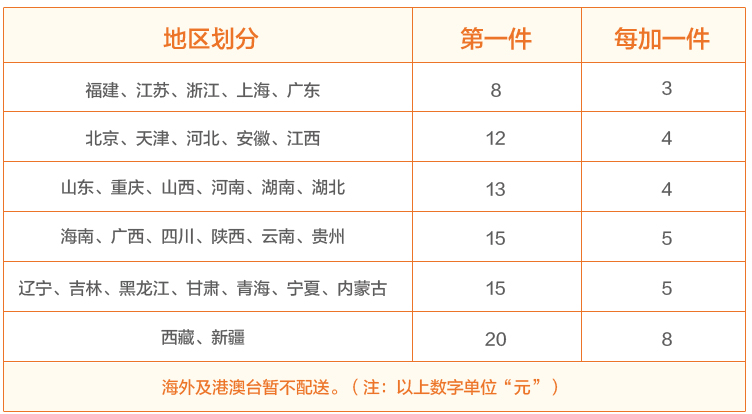 3.按地区收取:特步商家对发往不同地区,不同重量的包裹所需的运费自行设定。客户购买此类商品时,系统糊根据商家设定的自动计算所需运费。客户需连同商品及运费共同支付。
