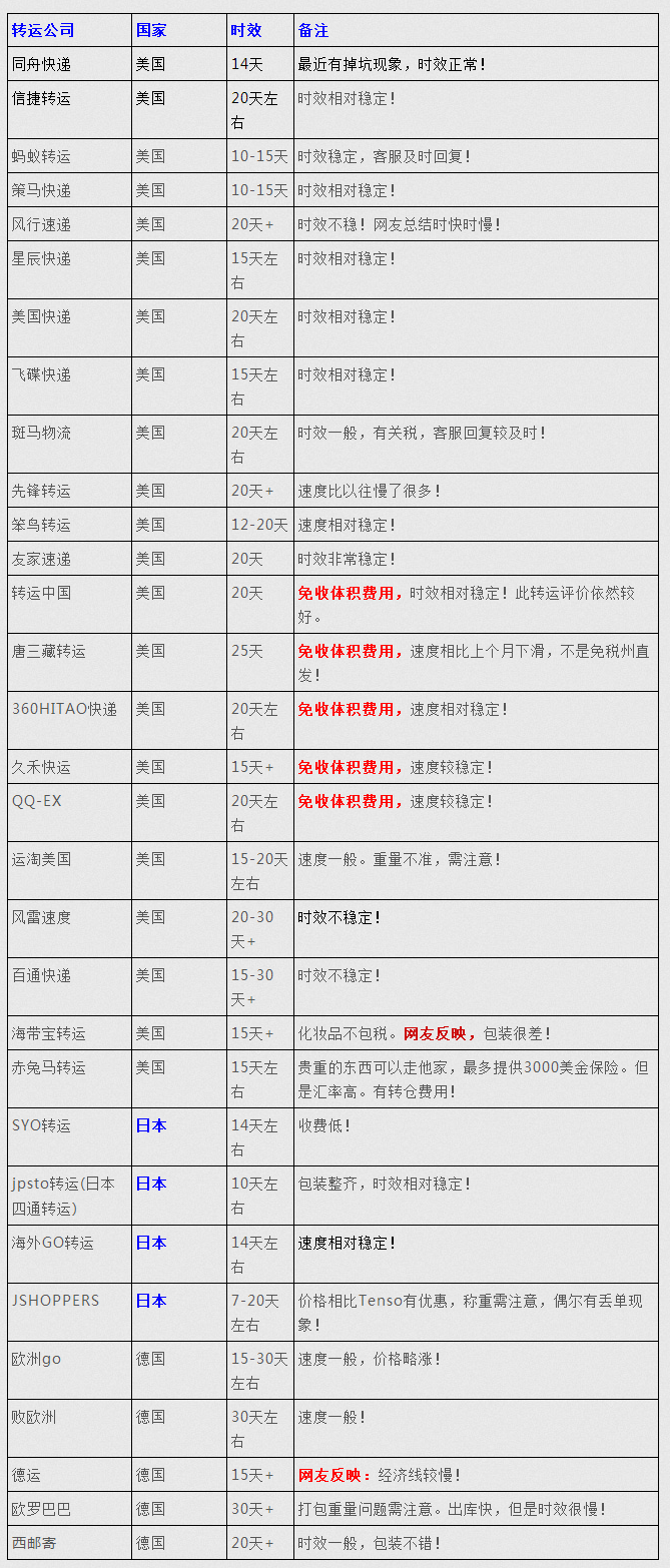 各转运快递公司选择注意点以及转运时效汇总表