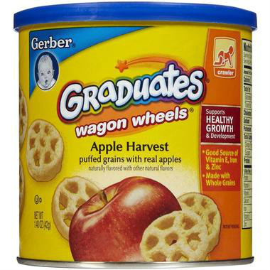 【商品介绍】Gerber嘉宝车轮泡芙苹果味,天然谷物成分与纯正水果带来丰富营养,富含丰富维生素E、铁、锌,有助于学会爬行阶段宝宝的健康成长。D设计成车轮形状,让刚学会抓握东西的宝宝能够训练自己吃饭的能力,泡芙放入口中后很快就会融化,不会产生卡喉危险。