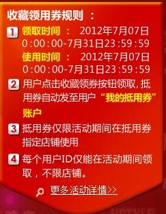 (1) 抵用券领取时间:2012年7月7日0:00:00-7月31日23:59:59;抵用券使用时间:领取成功30分钟后生效,有效期3天
