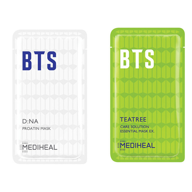 这款Mediheal&BTS联名合作款面膜包含D:NA保湿乳清蛋白面膜EX5片+茶树面膜EX5片,还附送BTS团体相册相片(14张)