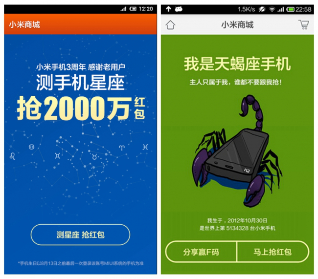 5、测完手机星座,即可抢红包,最高赢1000元红包!分享你的红包到微博,赢小米手机4 F码!