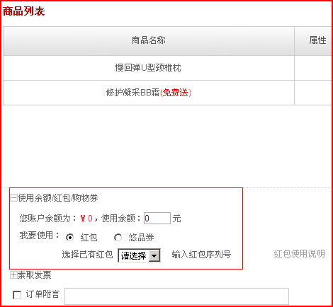 5. 使用方法:用户至悠品网购物,选择商品,加入购物车,去结算,填写收货人信息,并选择支付方式,选择使用红包,并输入优惠券序列号,然后点击提交订单