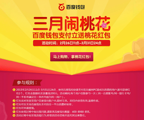 - 乐蜂网桃花节,百度钱包支付最高可得200元桃花红包: