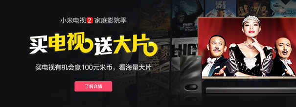 活动期间,每天从购买小米电视2(包括家庭影院版和单品)的用户中随机抽取10位送100元米币。分享带有#小米电视看大片#并@小米电视,还有机会赢取小米Note码,每天5个。