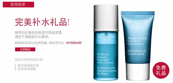 Clarins购物满125美元获完美补水礼品