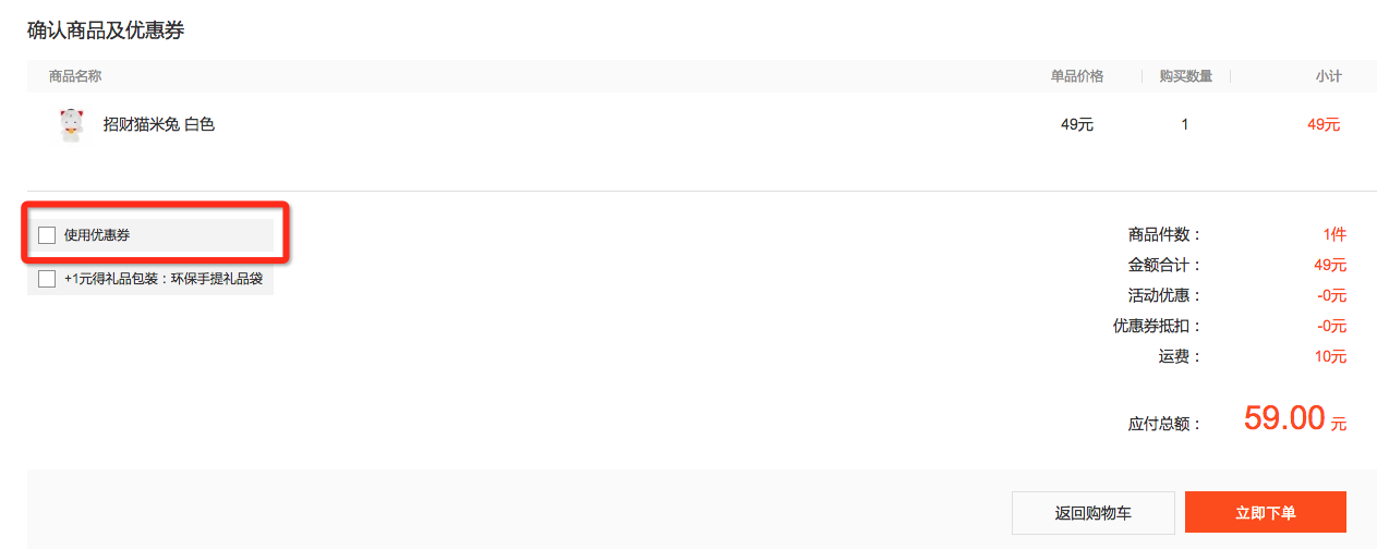 1)优惠券不可累加使用,每个订单只可使用一张优惠券。