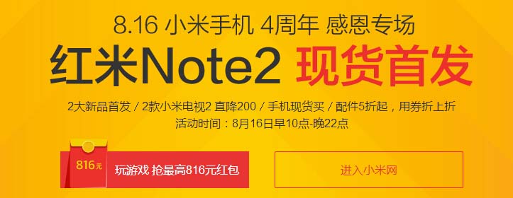 小米816四周年:红米Note2现货开售+配件5折起+用券折上折