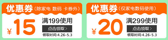 2.199-15元券,除家电、数码、卡券之外通用;299-20元券,仅限家电数码使用!