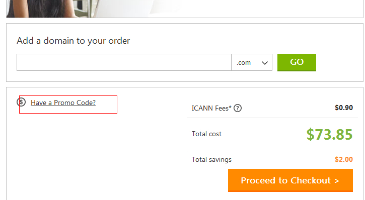 2.到结帐付款页面,在godaddy生成的对账单的下面有一个提示你输入优惠码的地方,点击“have a promo code?”,在里面输入使用的优惠码
