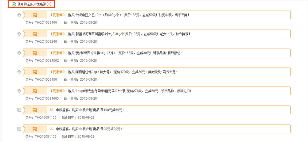 2.每张优惠券的使用条件不同,请根据您订单的实际情况选择优惠代码使用。