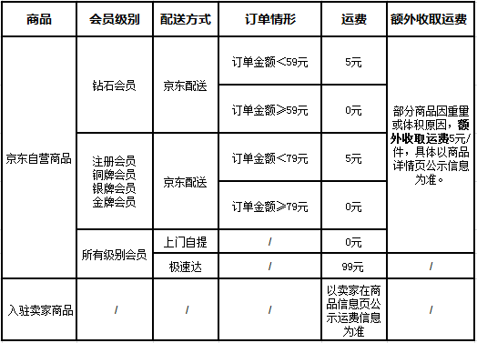 2)钻石级别会员用户购买京东自营商品小于59元,则需每单承担5元运费。