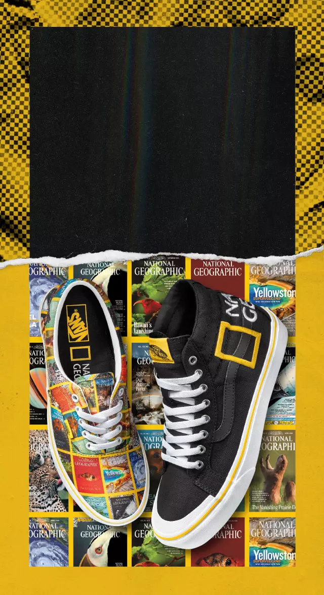 Vans und National Geographic haben gemeinsam eine Schuh- und Bekleidungskollektion entwickelt, um 130 Jahre niemals endende Abenteuerlust zu zelebrieren. Diese Kollektion feiert National Geographics lange Tradition des Entdeckens und Geschichtenerzählens.